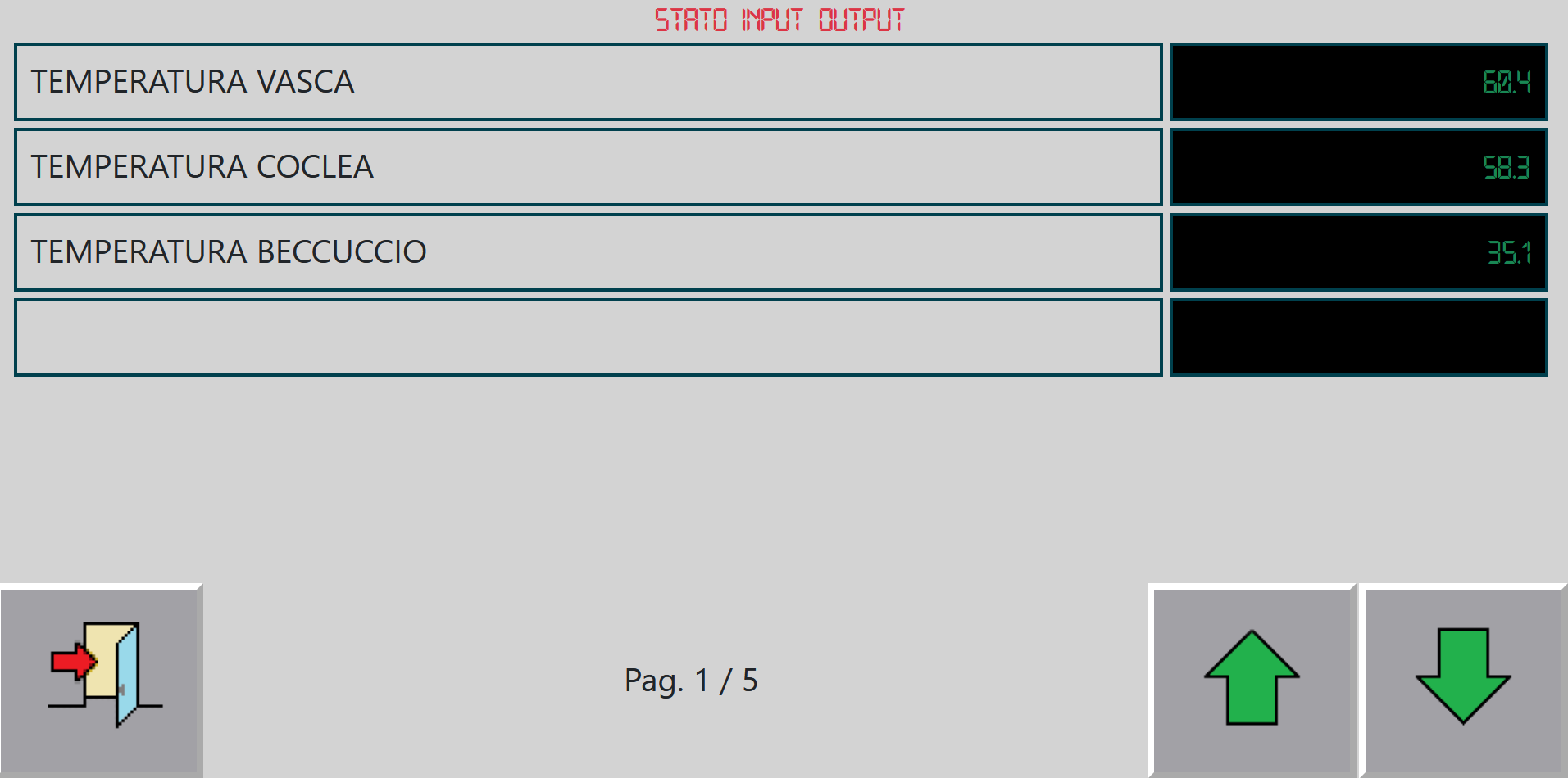 Per visualizzare gli stati degli input e output della macchina è necessario cliccare il bottone che contiene l’immagine sulla quale sono presenti le scritte “IN” e “OUT”. Questa azione aprirà una nuova schermata, nella quale, in 5 differenti pagine, sarà possibile visualizzare gli stati di ogni risorsa del dispositivo.
