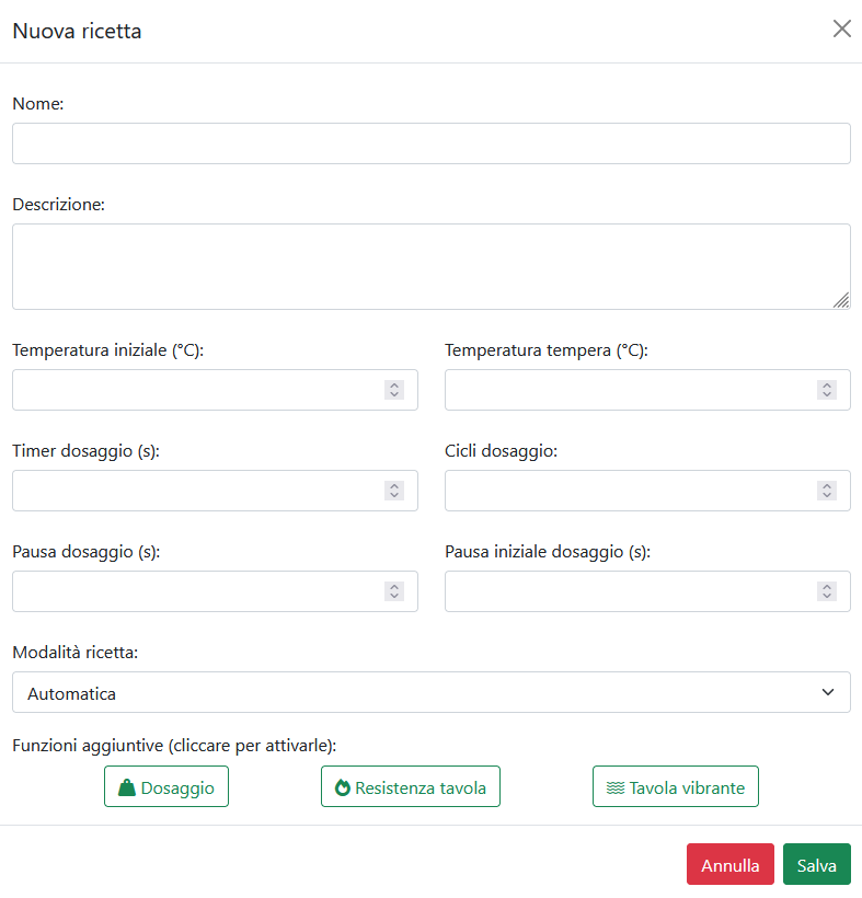 Per creare una nuova ricetta, è necessario cliccare il bottone verde in basso a destra. Una volta premuto, verrà visualizzata una schermata contenente un form tramite il quale è possibile selezionare i valori di ogni parametro della ricetta che si vuole creare. Tra i parametri l’unico facoltativo è la descrizione, tutti gli altri devono essere obbligatoriamente specificati. Le funzioni aggiuntive attivabili sono determinate in base alla modalità scelta (alcune modalità di esecuzione hanno la possibilità di attivare più funzioni rispetto ad altre).