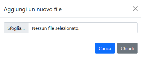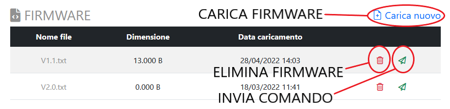E’ possibile caricare nel sistema un nuovo firmware premendo il link blu in alto a destra nel pannello di sinistra, con la scritta ‘Carica nuovo’. Cliccando su tale testo sì aprirà un pop-up attraverso il quale è possibile selezionare un file locale (salvato sul proprio PC) e caricarlo sul cloud. Una volta inviato al server dopo aver premuto sul bottone ‘Carica’, sarà visibile nella tabella posizionata nel pannello sinistro della pagina.