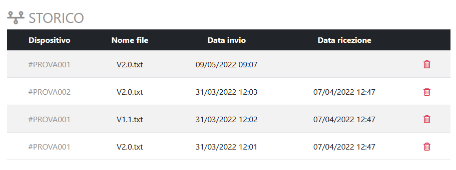 Dalla lista dei firmware è anche possibile eliminare uno dei file cliccando sull’icona rappresentante un cestino rosso.