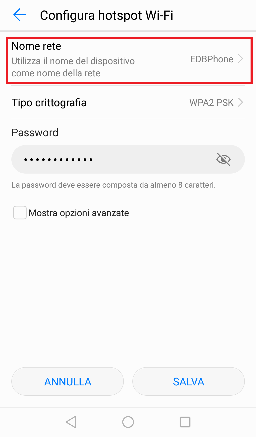 Per creare la rete Wi-Fi temporanea con le credenziali specificate è possibile sfruttare il servizio di hotspot disponibile su un qualsiasi telefono cellulare dotato di connessione dati.