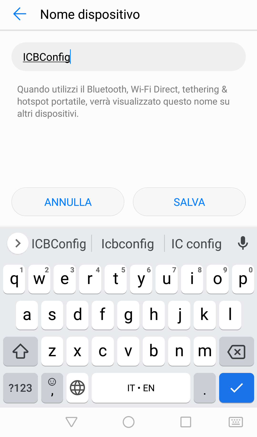 In questa pagina, aprire Configura hotspot Wi-Fi e, premendo su Nome rete, cambiare quello presente con ICBConfig.