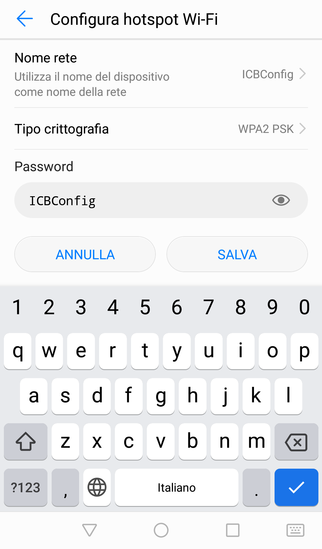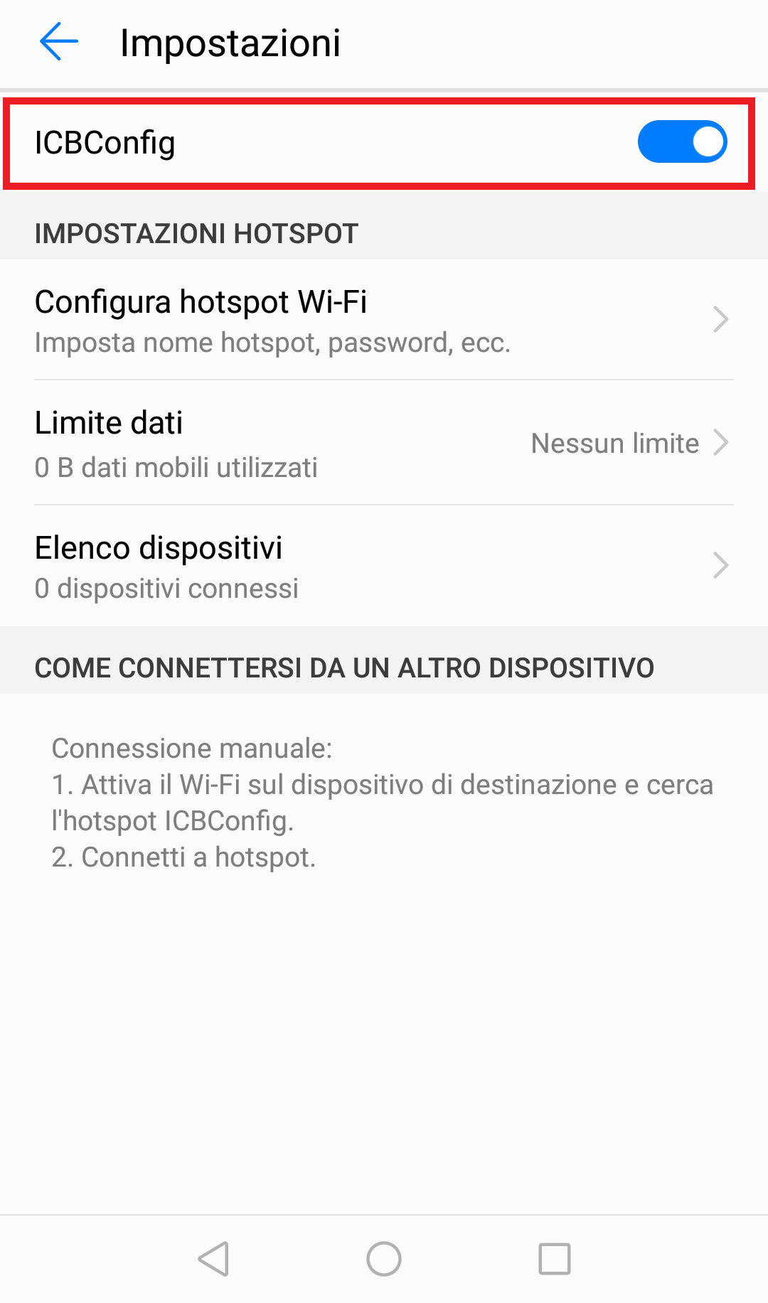 Una volta impostati i valori corretti per l’access point e per la password è necessario attivare l’hotspot del telefono; per fare ciò premere e attivare la spunta accanto al nome ICBConfig.