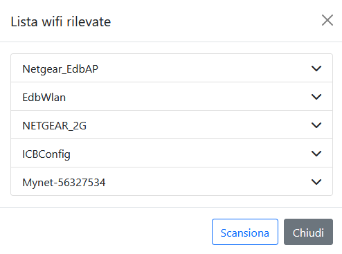In questo modo viene inviato al dispositivo un comando di scansione delle reti Wi-Fi, le quali vengono elencate all’utente nella schermata appena aperta. Da qui è possibile cliccare sul nome della rete alla quale ci si vuole connettere e specificare la password che la macchina deve usare per potersi effetivamente collegare.