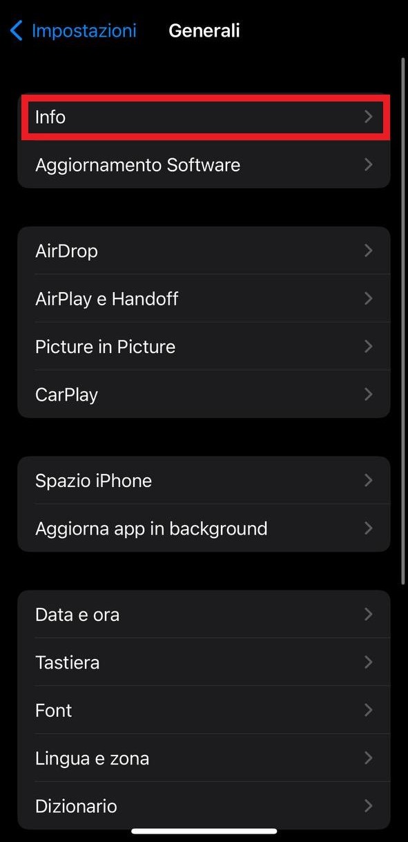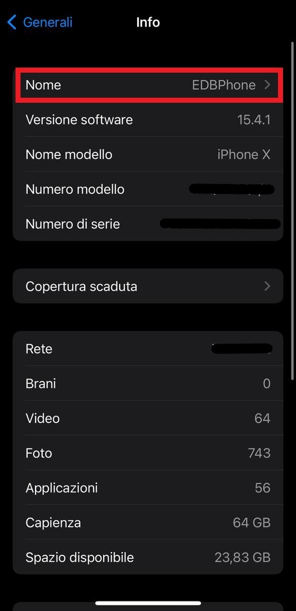 Per cambiare il nome dell’hotspot su IOS è necessario modificare il nome del telefono. Per fare ciò, aprire Impostazioni > Generali > Info, premere Nome e cambiare quello presente con ICBConfig.