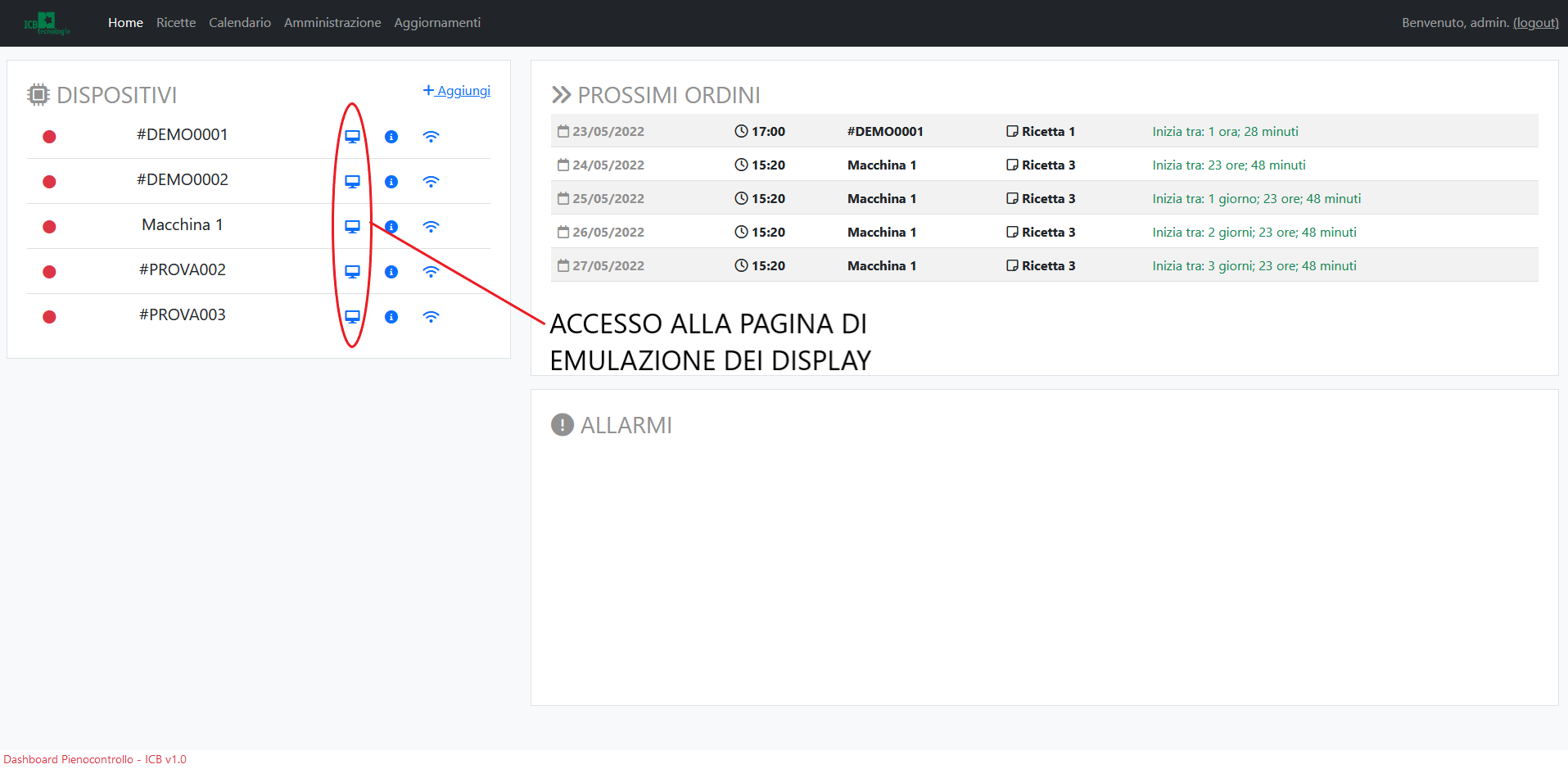 Per accedere alla pagina di emulazione del display di una macchina è necessario, dopo aver effettuato il login iniziale, cliccare sul bottone blu raffigurante uno schermo (posto alla destra del seriale della macchina da visualizzare). Tale bottone è visibile dalla pagina home (la prima caricata subito dopo l’accesso).