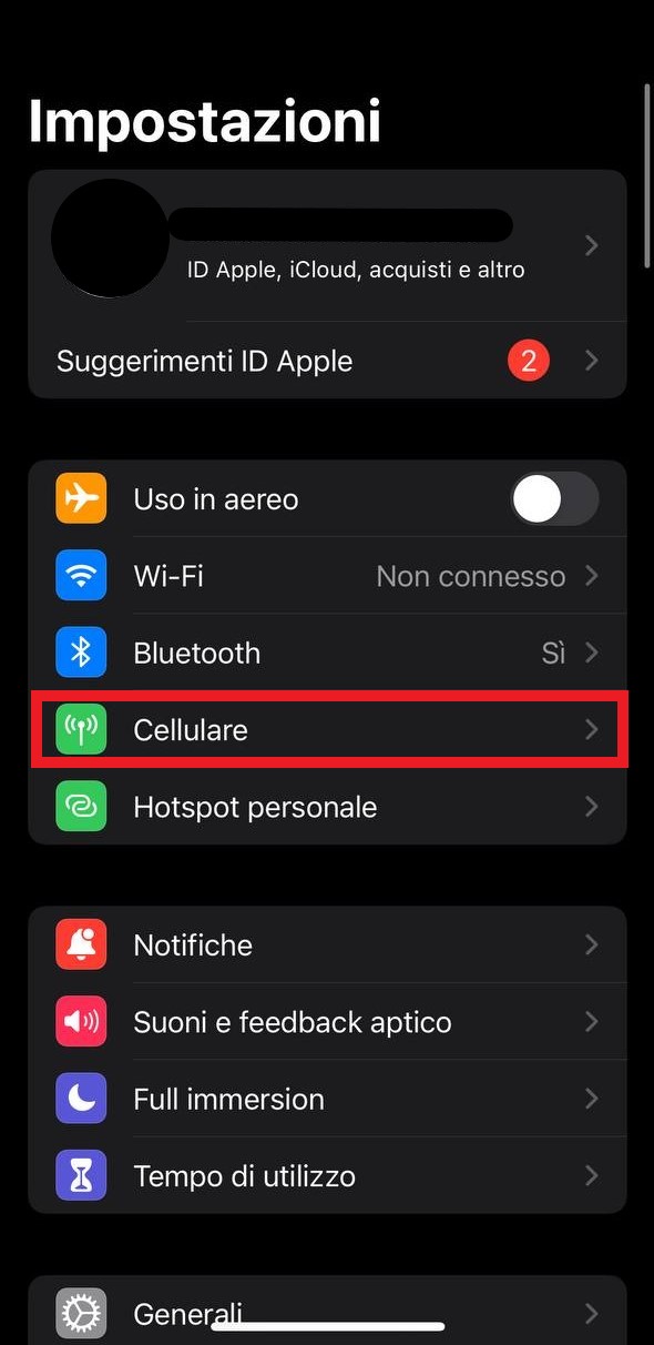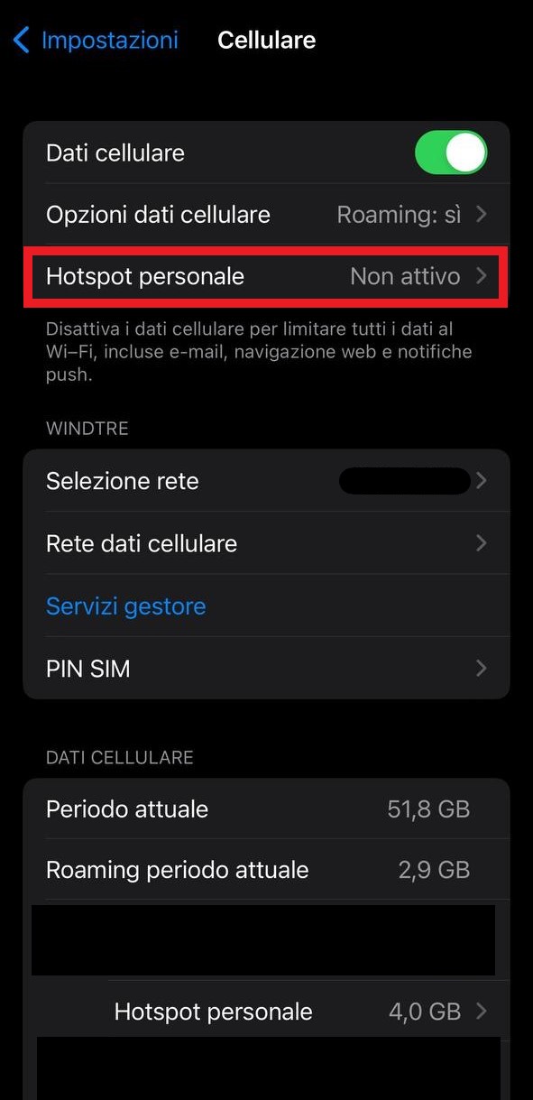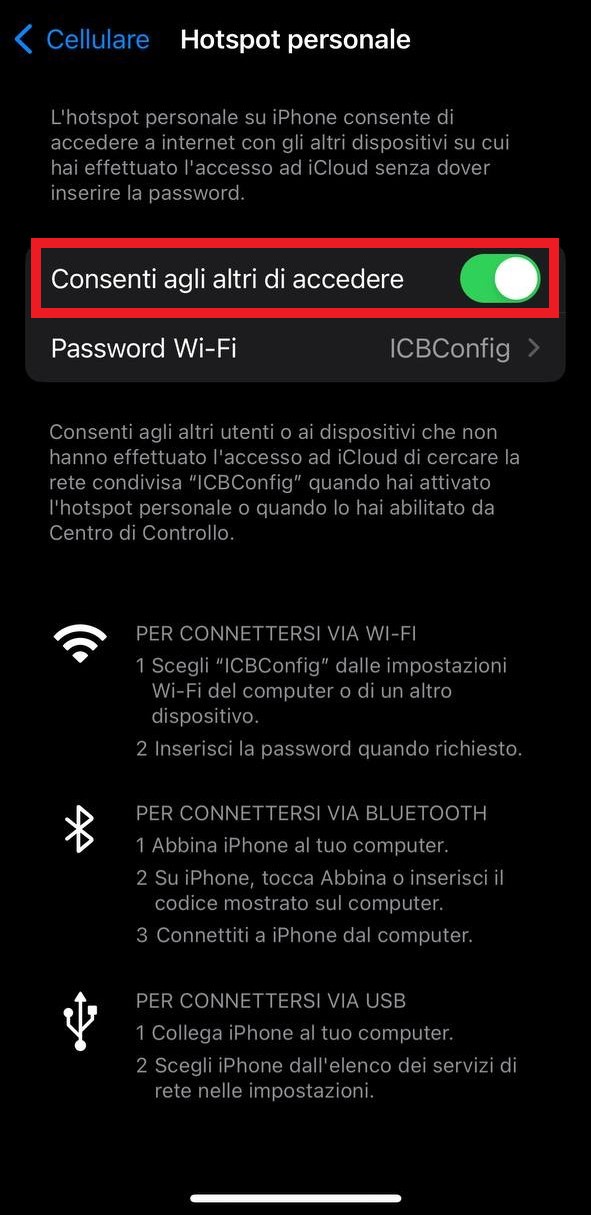 Una volta impostati i valori corretti per l’access point e per la password è necessario attivare l’hotspot del telefono; per fare ciò aprire Impostazioni > Cellulare > Hotspot personale e attivare la spunta Consenti agli altri di accedere.