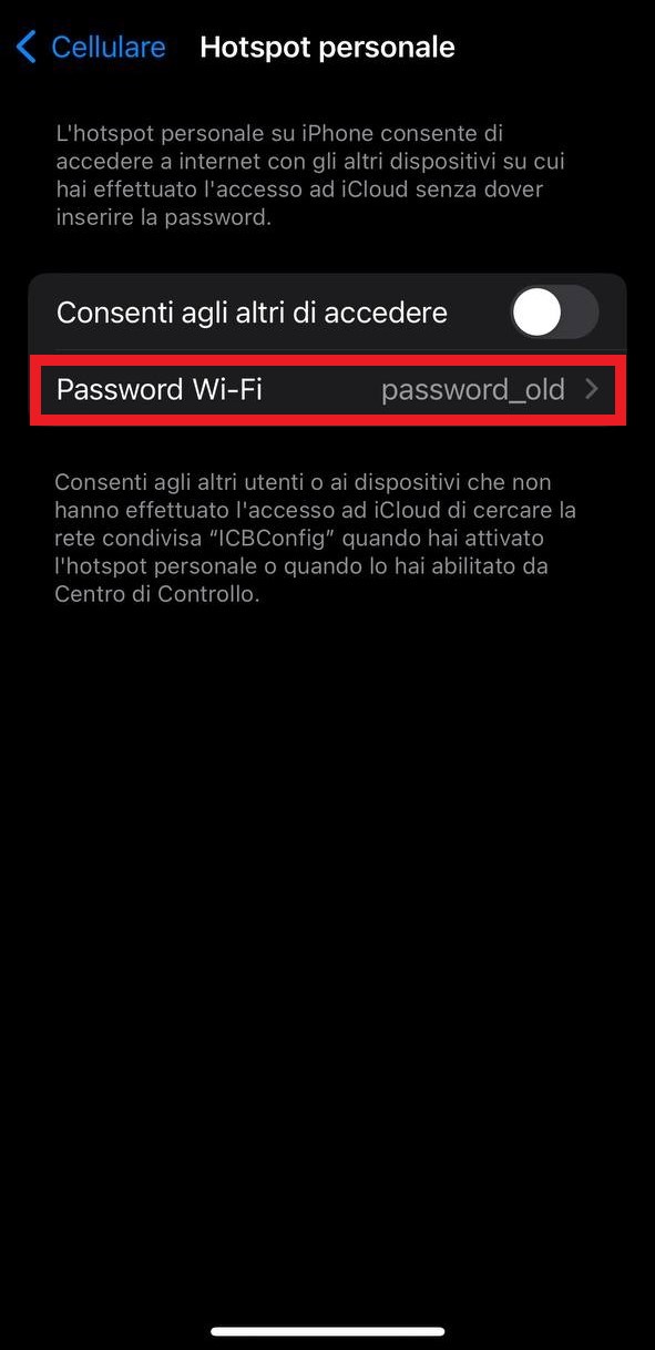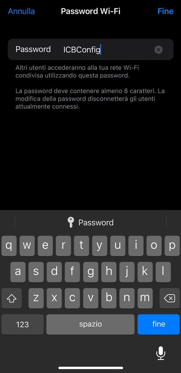 Per cambiare la password dell’hotspot, aprire Impostazioni > Cellulare > Hotspot personale, premere Password Wi-Fi e cambiare la password impostata con ICBConfig.