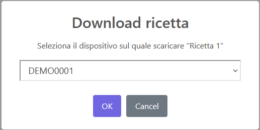 Per ottimizzare l’uso della memoria dei dispositivi, le ricette scaricate da questi ultimi sono tutte quelle “indispensabili”, ovvero quelle programmate in ordini di lavoro futuri. E’ possibile però “forzare” il dowload di una ricetta su una macchina premendo il bottone verde con la scritta ‘Download’ (posto nel pannello di ogni ricetta) e selezionando dalla lista il dispositivo al quale mandare la ricetta.