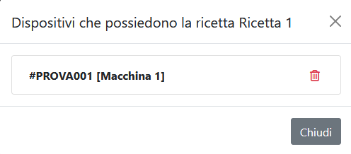 Tramite il bottone blu con la scritta ‘Dispositivi’, è possibile visualizzare la lista delle macchine che hanno scaricato in maniera “forzata” quella ricetta. Per eliminare una delle associazioni è necessario cliccare sull’icona del cestino rosso () posta a lato del nome del dispositivo.